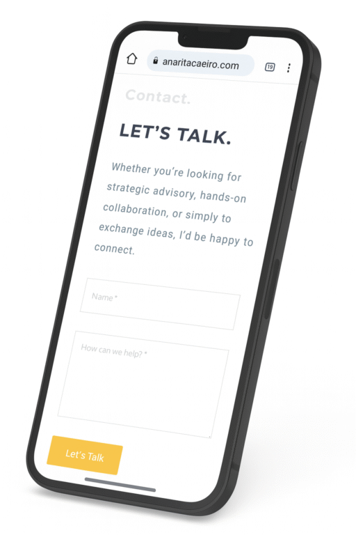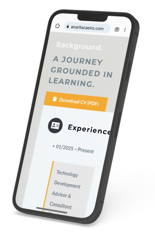 The structure of the site follows a simple and intentional information architecture (Home, About, Background, Projects, Skills, and Contact) giving visitors a straightforward path to understand my trajectory, expertise, and the type of impact I drive. The contact section is supported by my professional email (support@anaritacaeiro.com), ensuring a dedicated channel for outreach.